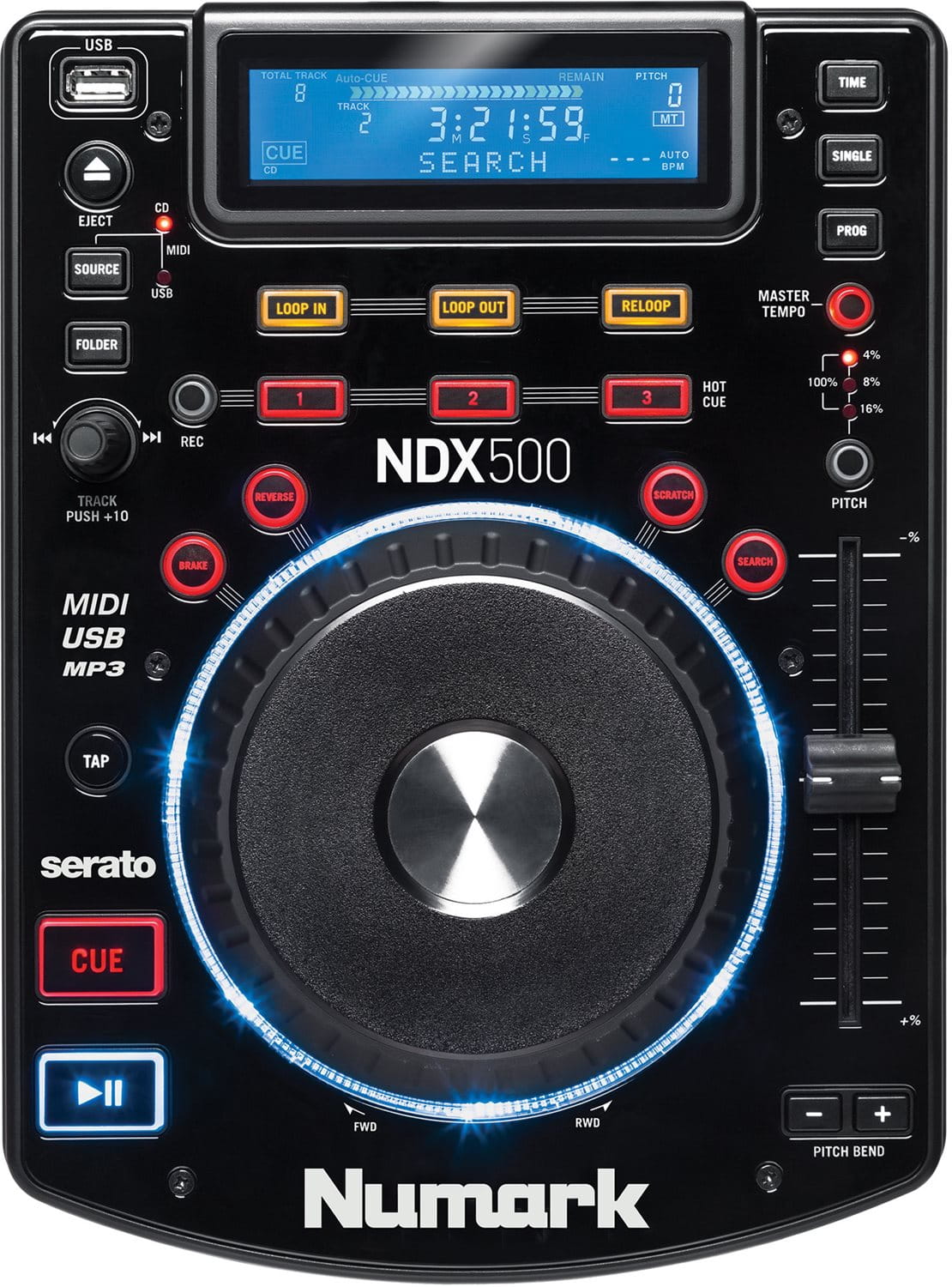 Możesz wykorzystać również wbudowany interfejs audio USB oraz tryb USB-MIDI, konfigurując NDX’a z oprogramowaniem DJ. Wszystkie funkcje kontrolera są zmapowane w aplikacji Serato DJ (sprzedawanej osobno) – wystarczy jedynie podłączyć kontroler do komputera by w pełni cieszyć się jego możliwościami. Odtwarzacz oferuje również technologię antywstrząsową Numark Anti-Shock, wykorzystującą bufor pamięci.