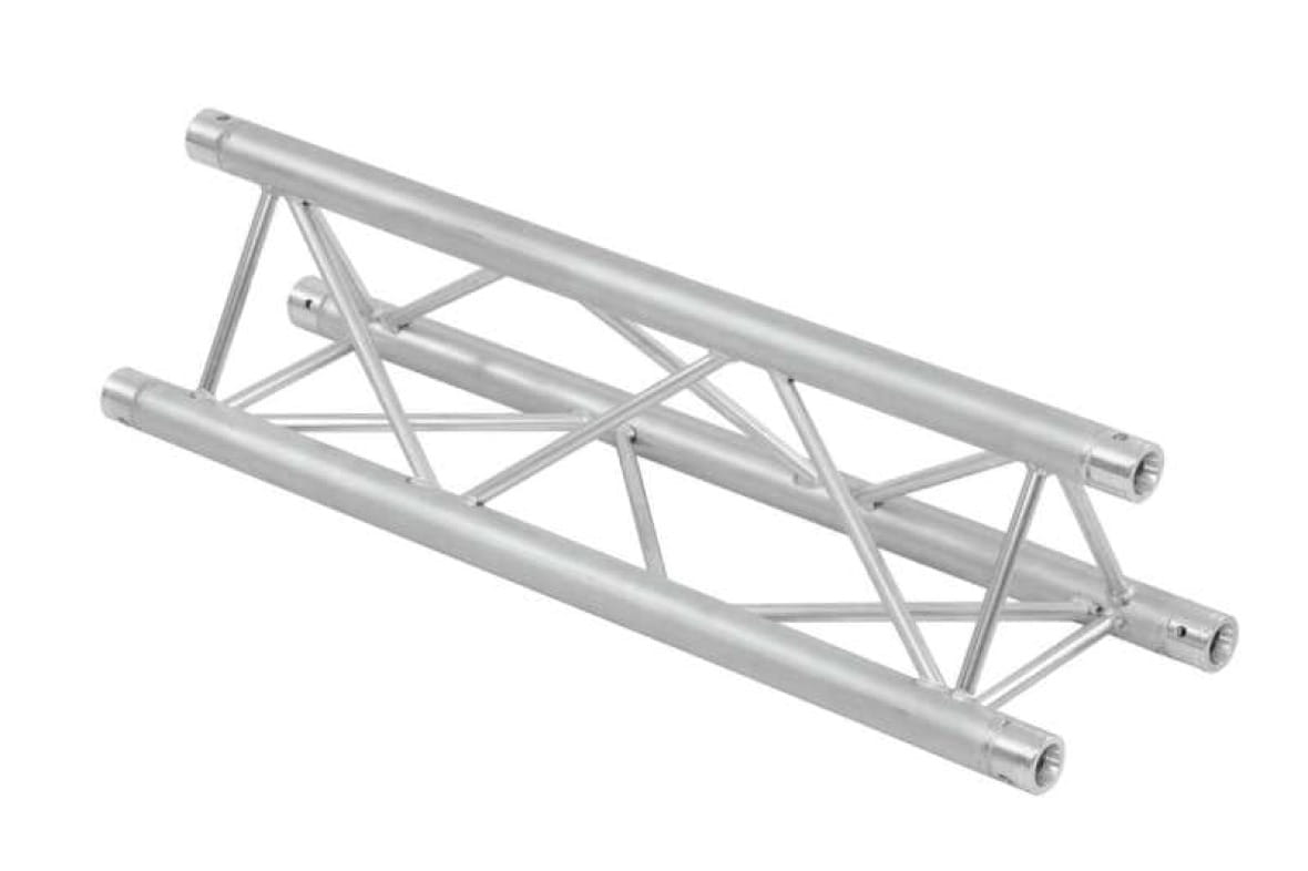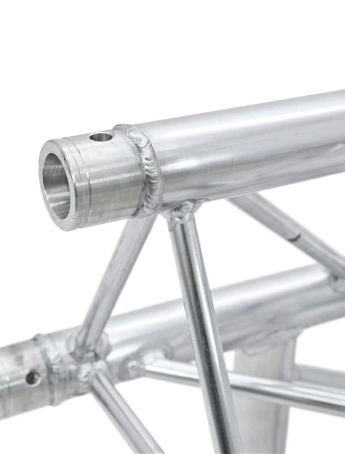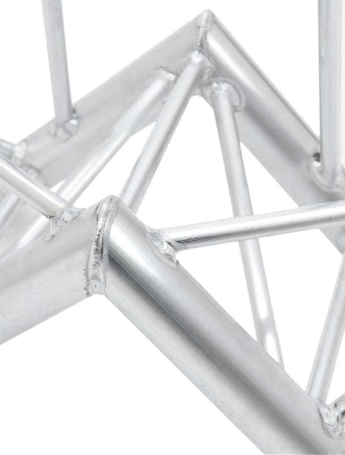 Konstrukcja opiera się na trzech głównych rurach o średnicy 50 mm i ściance 2 mm, połączonych za pomocą czopów, stożków i sworzni. Stożkowy system złącz idealnie dopasowuje się do pasów głównych, maksymalizując nośność. Dzięki zastosowaniu technologii Quick-Lock montaż i demontaż kratownic jest szybki, efektywny i estetyczny — idealne rozwiązanie przy częstych zmianach scenografii.