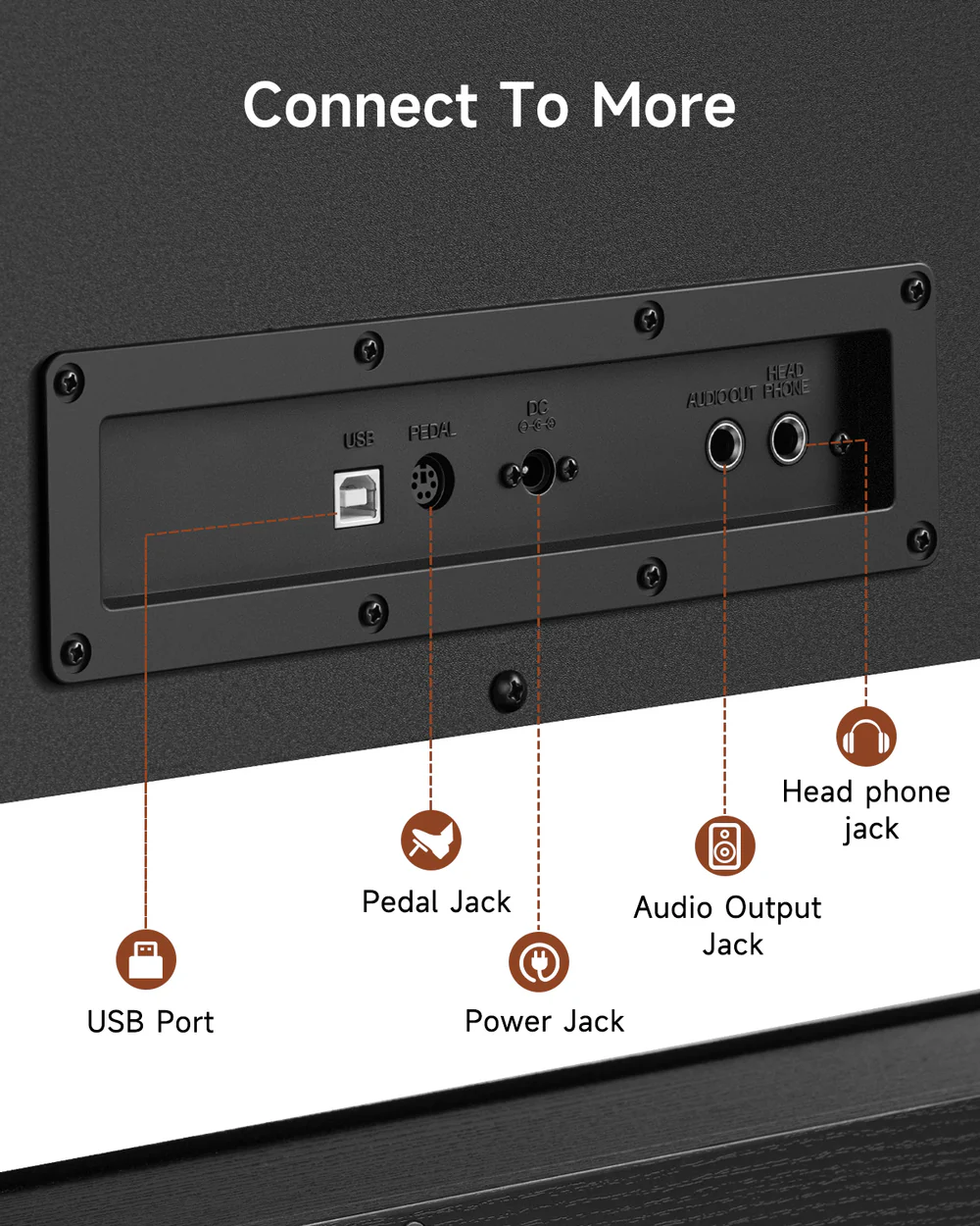 USB‑MIDI i wyjście słuchawkowe – wygodne podłączenie do komputera lub słuchawek.