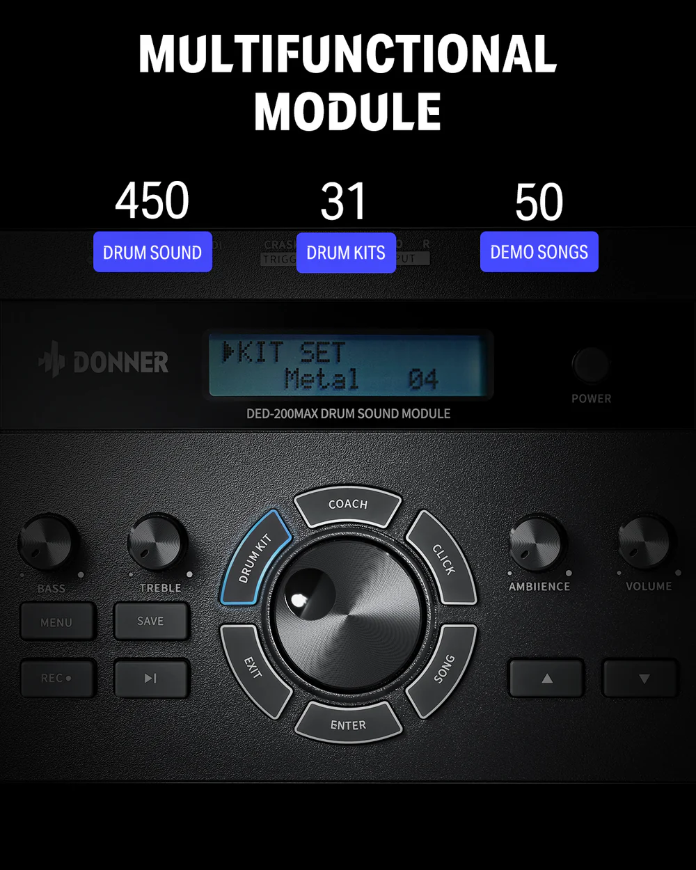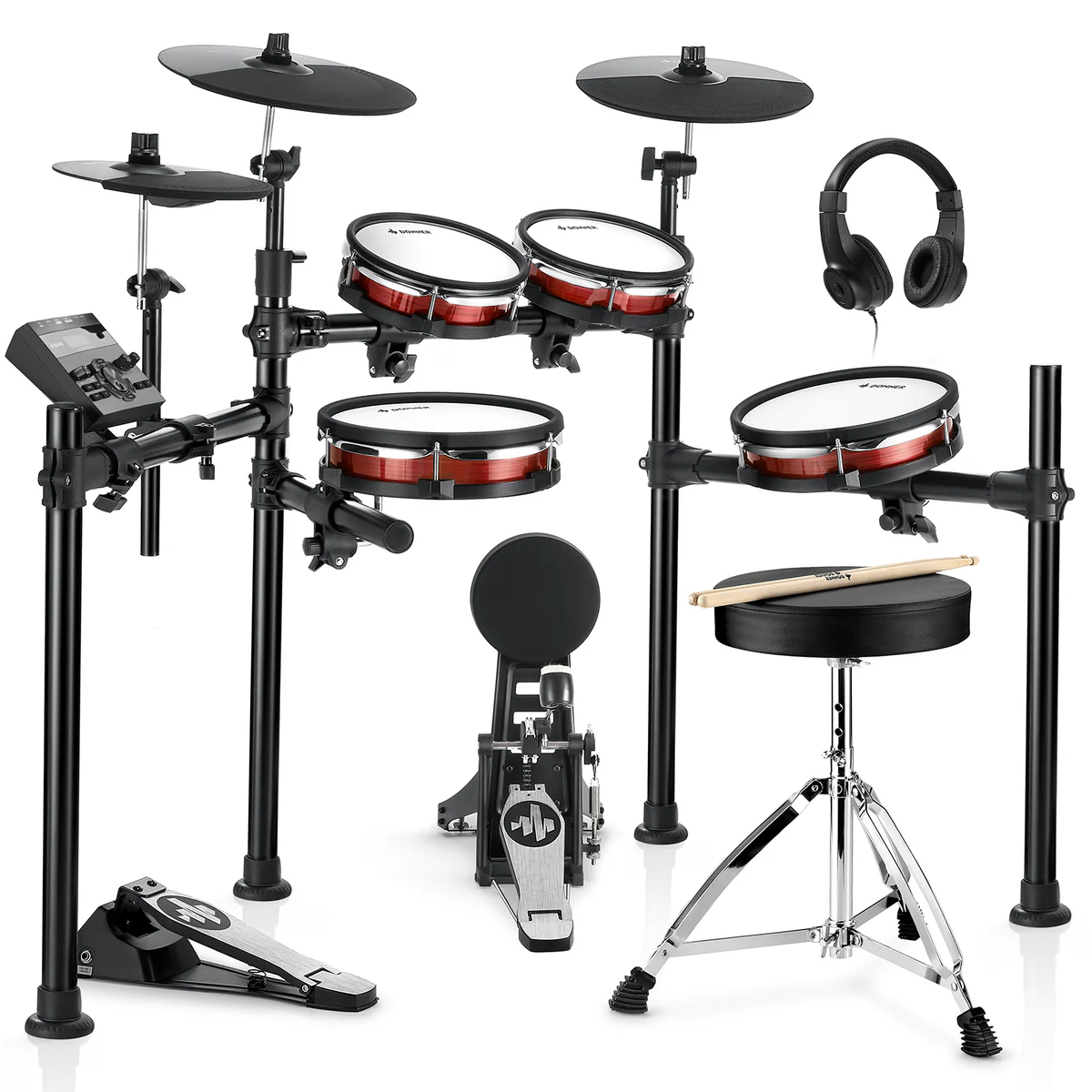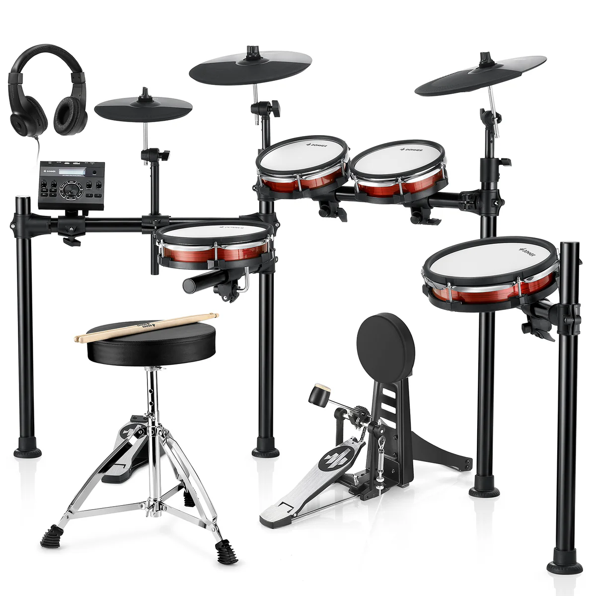 Rozwiń swoje umiejętności perkusyjne z Donner DED200 Max, elektronicznym zestawem bębnów stworzonym z myślą o początkujących i średniozaawansowanych muzykach. Ten kompletny zestaw z padami, statywem i modułem brzmień pozwala ćwiczyć w domu, studio lub podczas prób w dowolnym pomieszczeniu.