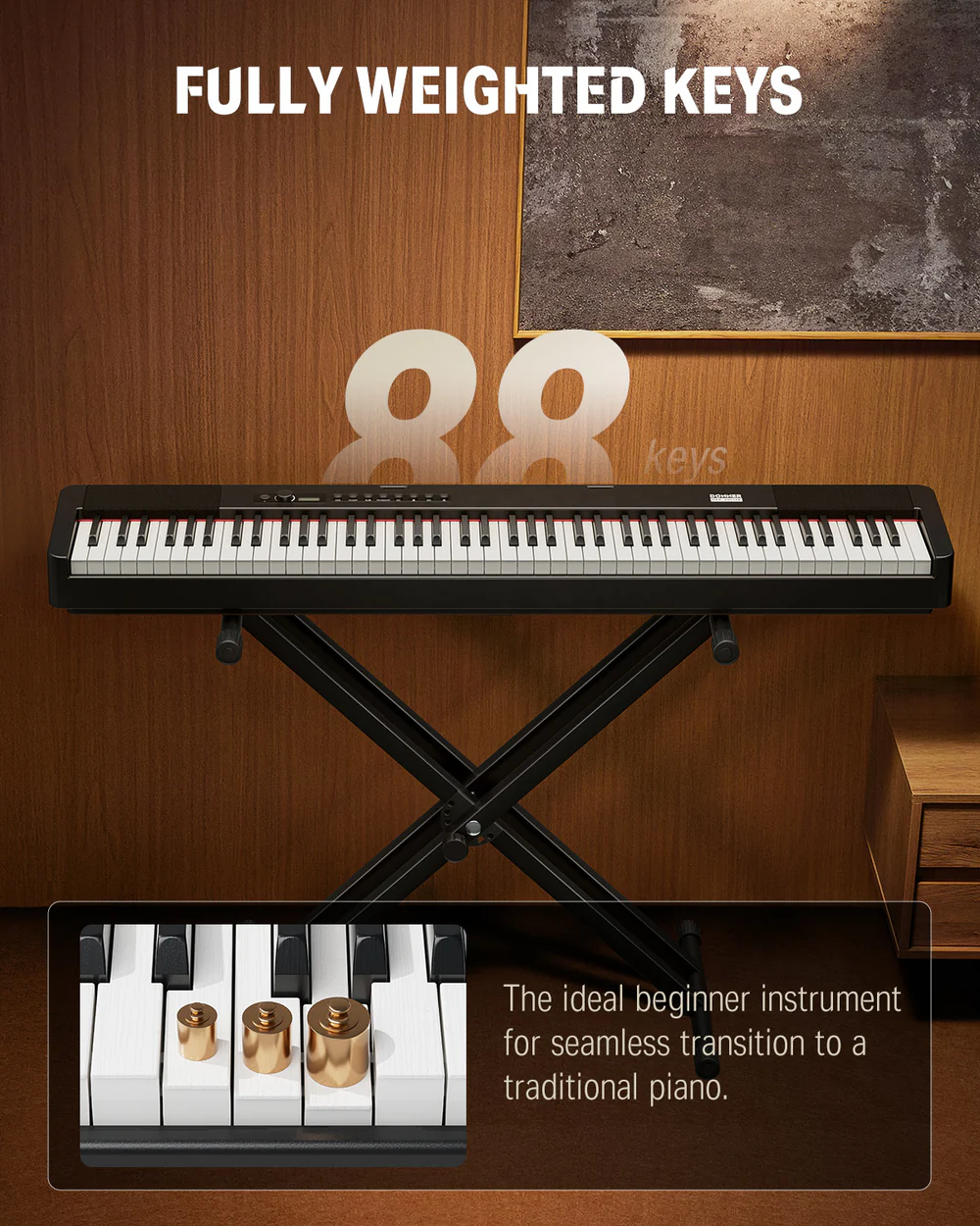 Donner DEP20 Lite to pełnowymiarowe pianino cyfrowe z 88 klawiszami, które łączy klasyczne wrażenia gry z nowoczesnymi funkcjami cyfrowymi. Dzięki ważonej klawiaturze typu graded hammer action instrument reaguje naturalnie na siłę nacisku, co ułatwia naukę techniki pianistyki i pozwala wydobywać pełne, ekspresyjne brzmienie — podobne do fortepianów akustycznych.