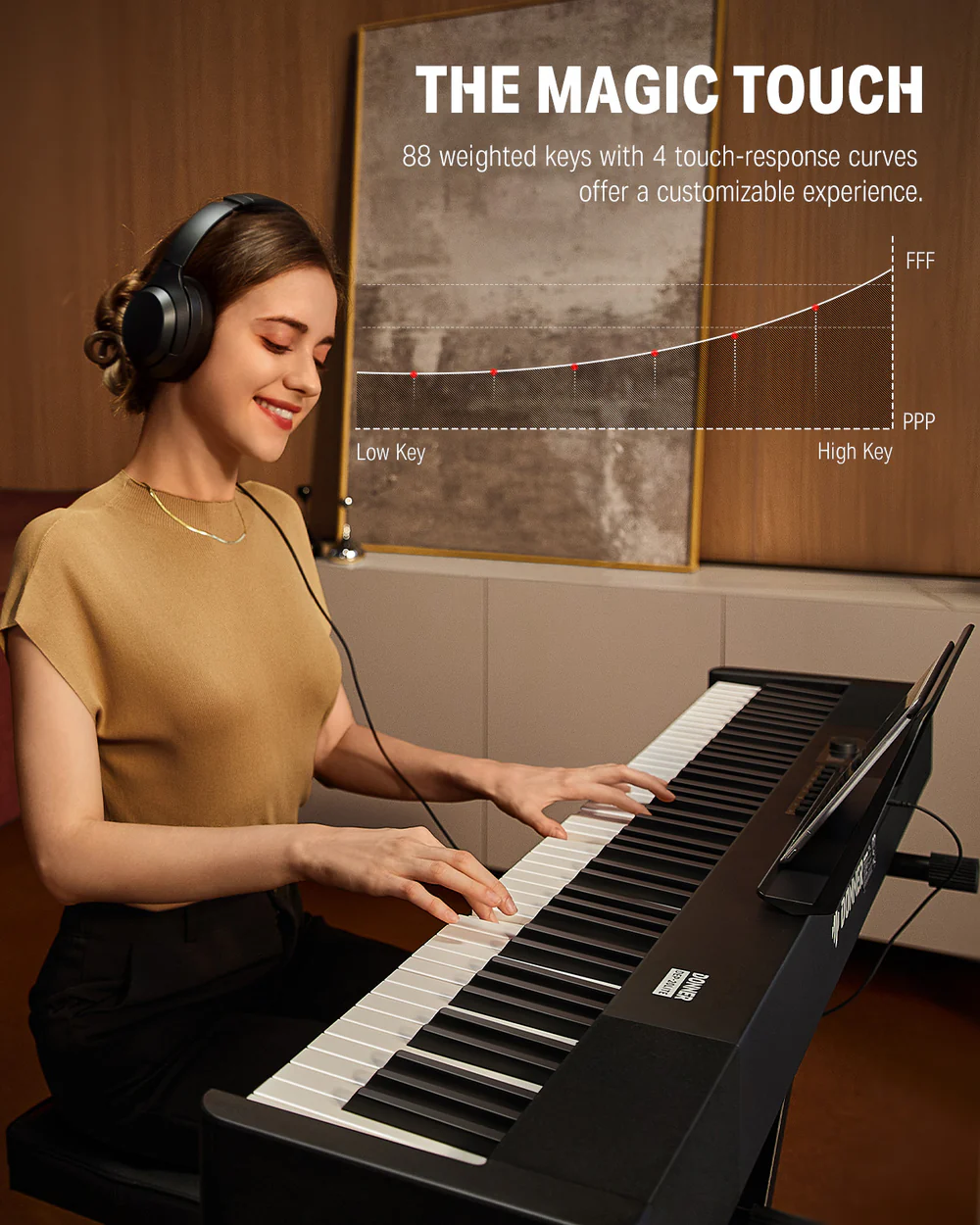 Wzmocnione głośniki stereo zapewniają klarowne i pełne dźwięki bez konieczności podłączania dodatkowego nagłośnienia, a podświetlany wyświetlacz ułatwia nawigację po funkcjach instrumentu. Kompaktowa i estetyczna konstrukcja sprawia, że pianino dobrze prezentuje się w domu, studio lub sali prób.