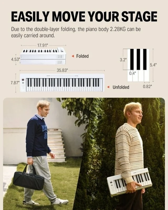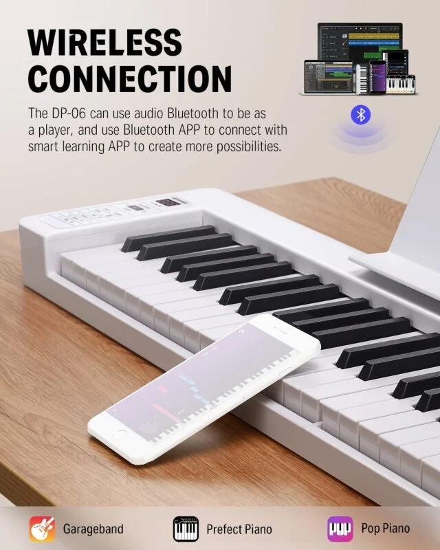 Donner DP06 EC6633 to innowacyjne składane pianino cyfrowe 61 klawiszy, idealne dla początkujących, uczniów i osób grających w podróży. Dzięki półważonej klawiaturze, wbudowanemu akumulatorowi, funkcji Bluetooth audio i MIDI oraz lekkiej, składanej konstrukcji, możesz cieszyć się naturalnym brzmieniem fortepianu w domu lub na wyjazdach. Instrument oferuje 128 barw, 128 rytmów, metronom, nagrywanie i tryby edukacyjne, co ułatwia naukę i rozwój umiejętności gry.