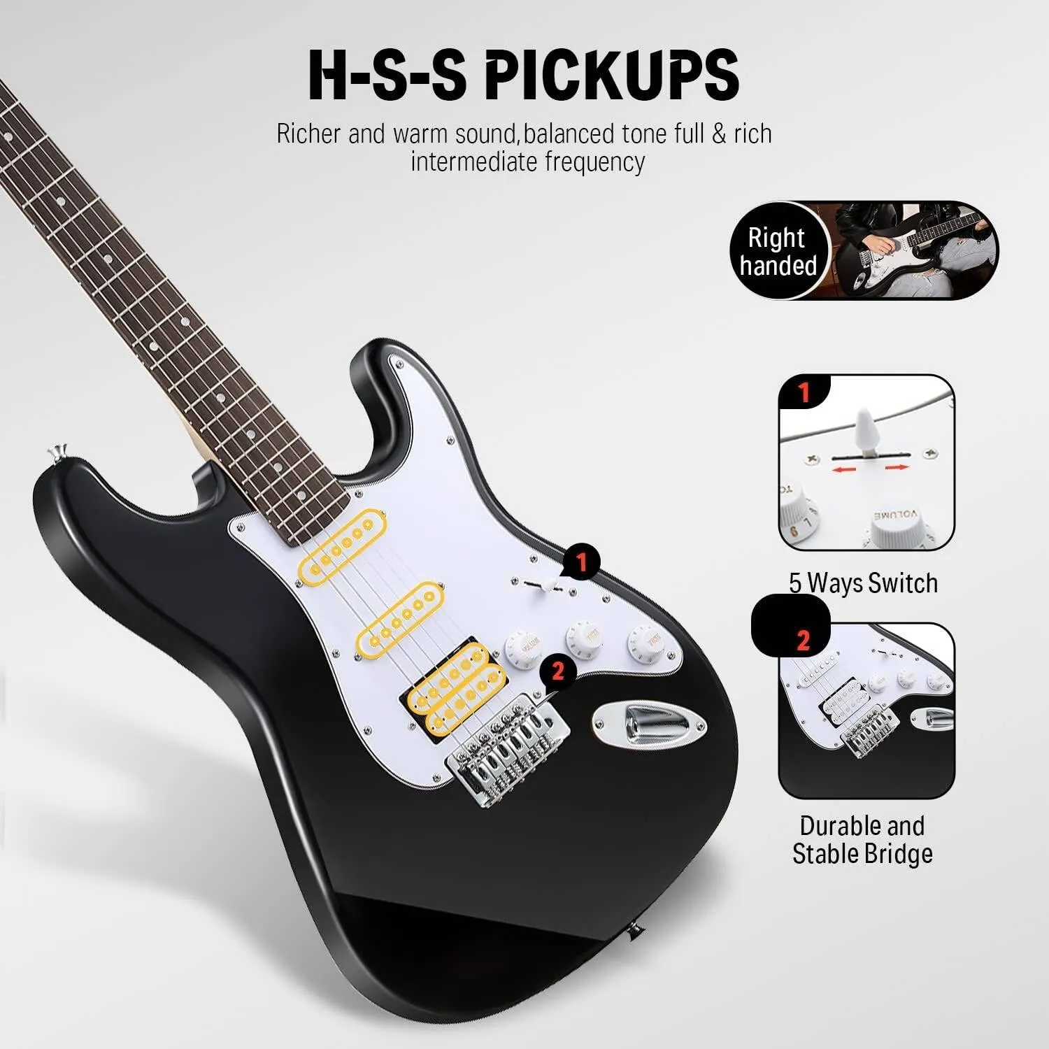 Konfiguracja H‑S‑S w połączeniu z 5-pozycyjnym przełącznikiem pickupów oraz regulatorami Volume i Tone pozwala uzyskać zarówno czyste, jasne dźwięki, jak i przesterowane, mocniejsze brzmienie, idealne do rocka, bluesa czy popu.