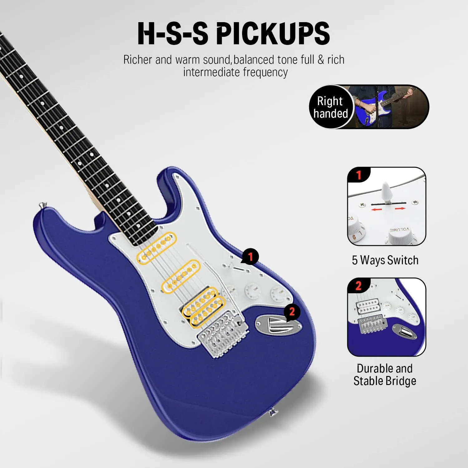 Konfiguracja S‑S‑H pozwala uzyskać zarówno jasne, czyste tony, jak i mocne, przesterowane brzmienie – idealne do rocka, bluesa, popu i jam session. 5-pozycyjny przełącznik oraz regulatory Volume i Tone umożliwiają szybkie dopasowanie dźwięku do Twojego stylu.