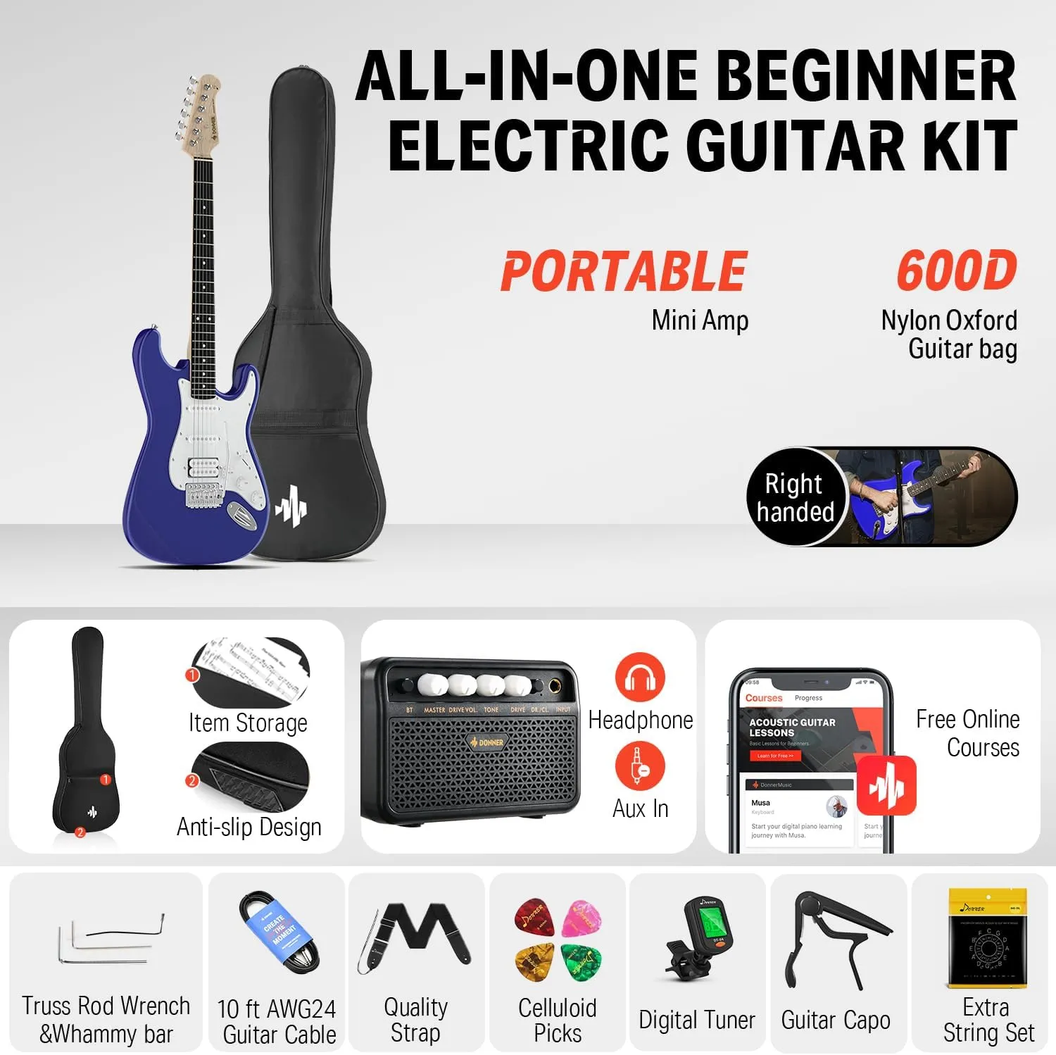 Donner DST-100L Sapphire Blue to kompletny zestaw gitarowy typu ST-Style, idealny dla osób rozpoczynających przygodę z gitarą elektryczną. W zestawie znajduje się gitara z konfiguracją S‑S‑H (Single Coil + Humbucker), mini wzmacniacz oraz wszystkie niezbędne akcesoria, dzięki czemu możesz zacząć grać od razu po rozpakowaniu.
