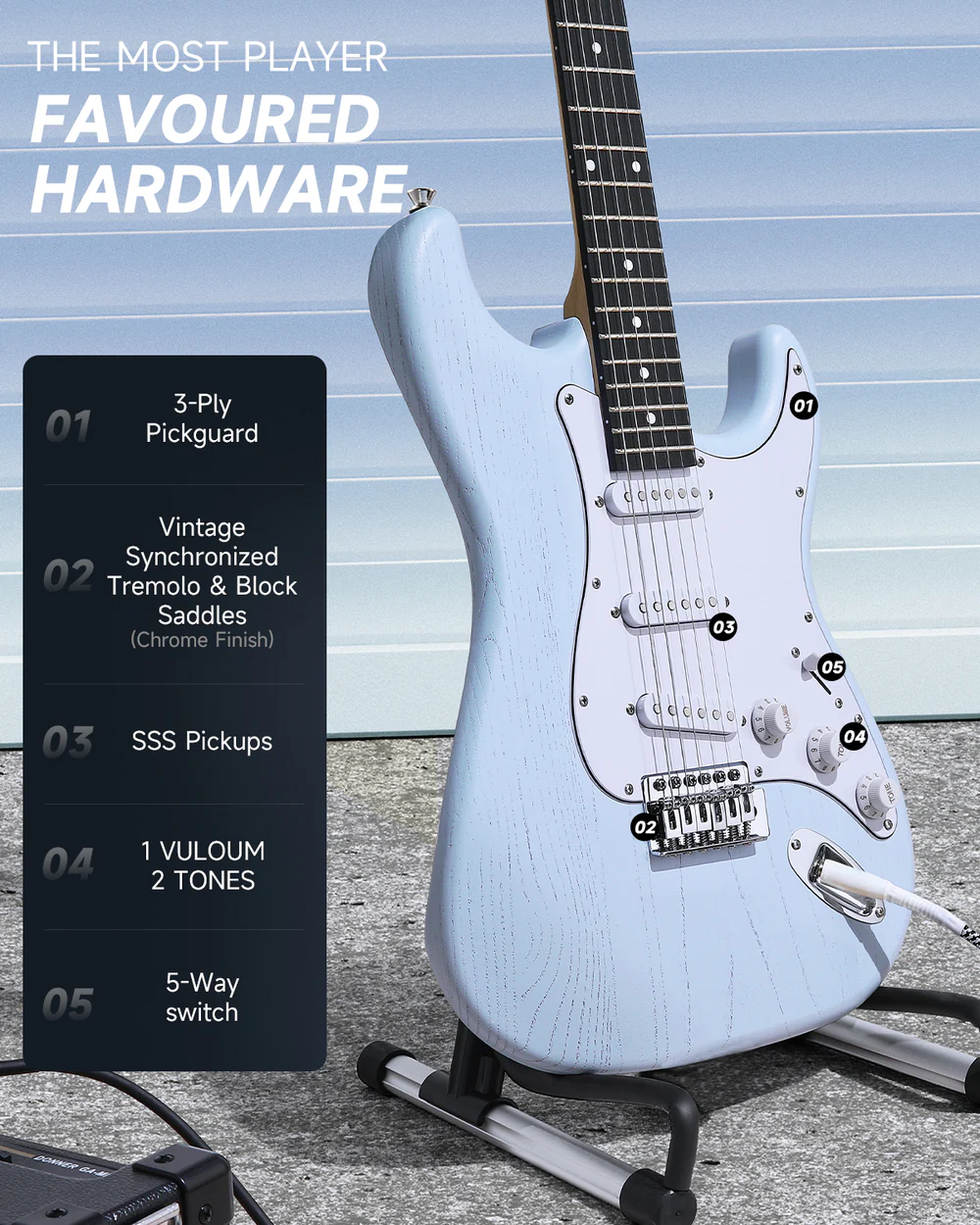 Efektowne, niebieskie wykończenie nadaje gitarze nowoczesny charakter, wyróżniając ją zarówno na scenie, jak i w pokoju muzycznym.