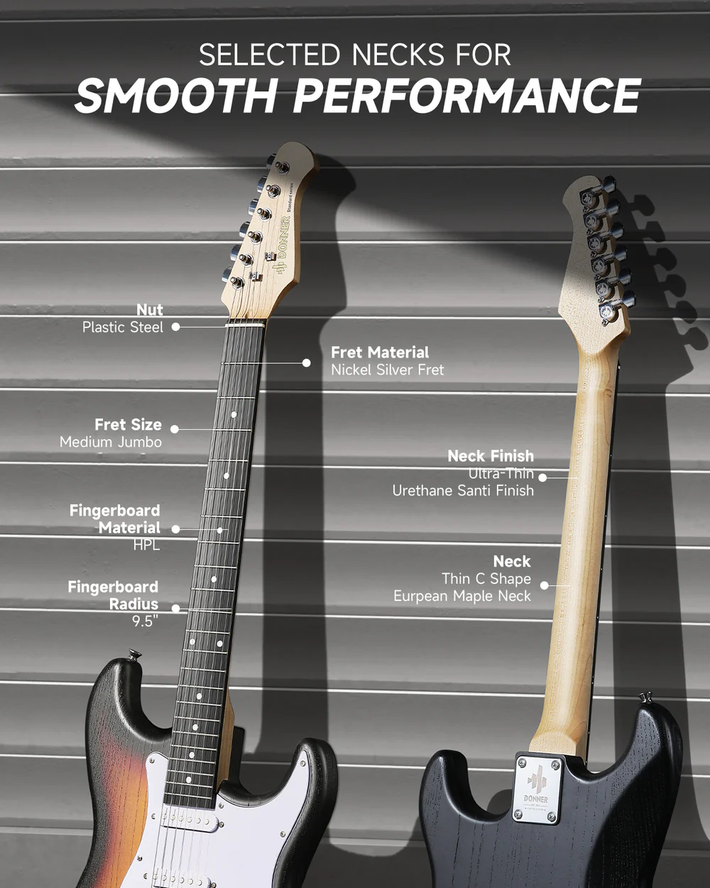 Donner DST-80 Sunburst to kompletny zestaw gitarowy, który daje wszystko, czego potrzebujesz na start. Klasyczny wygląd, wygodna konstrukcja i uniwersalne brzmienie sprawiają, że to idealny wybór dla początkujących i osób wracających do gry.