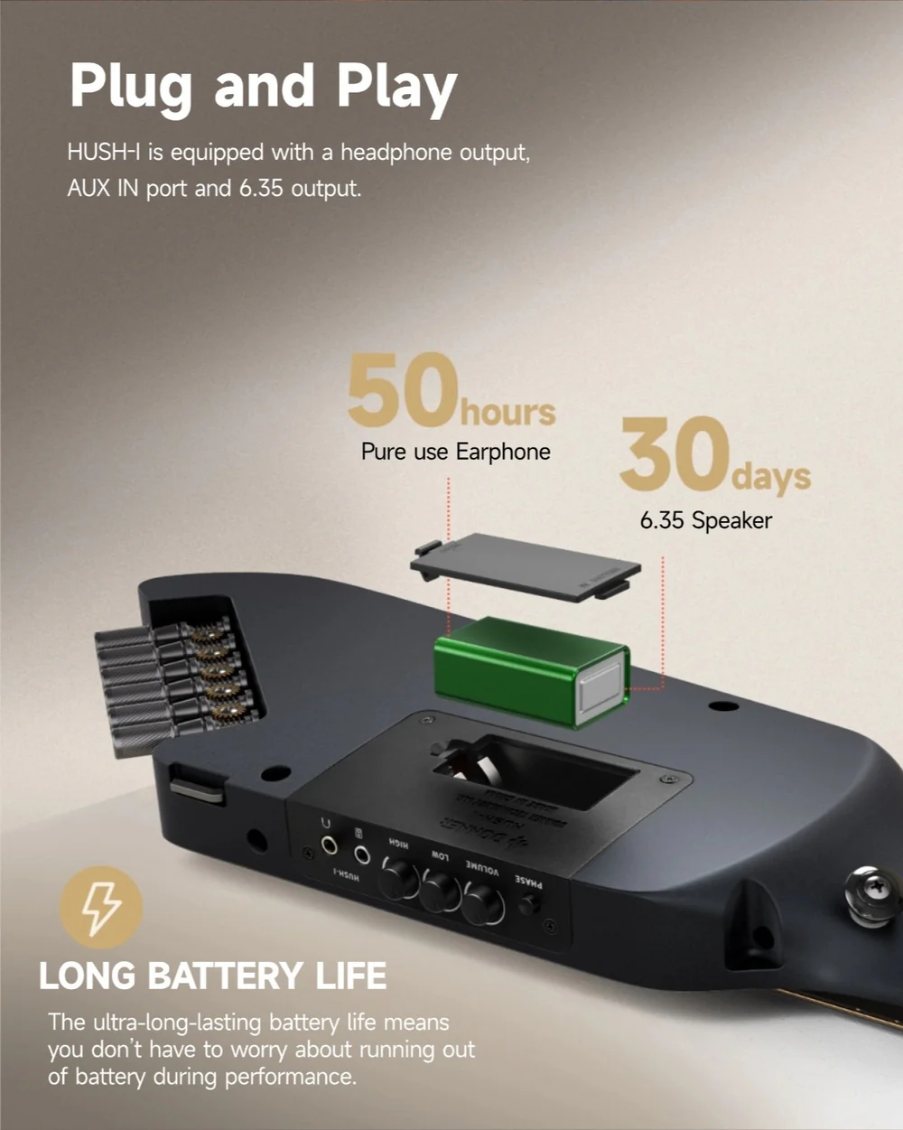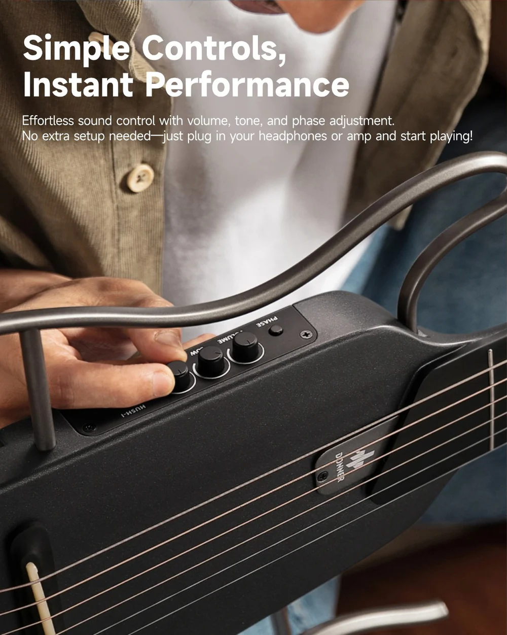 Zintegrowany przetwornik piezoelektryczny i dedykowany przedwzmacniacz Donner zapewniają doskonałą jakość dźwięku. Instrument oferuje pełną kontrolę nad brzmieniem dzięki regulacji za pomocą pokręteł „Volume”, „High” i „Low”. Co więcej, unikalny przycisk „Phase” odpowiada za stabilne brzmienie podczas występów na żywo. Dźwięk może być przesyłany zarówno przez wyjście słuchawkowe, jak i tradycyjne wyjście kablowe, gwarantując wszechstronność zastosowań. Donner HUSH-I to instrument, który doskonale sprawdzi się zarówno na scenie, jak i w podróży.
