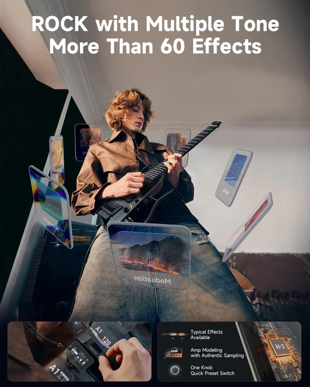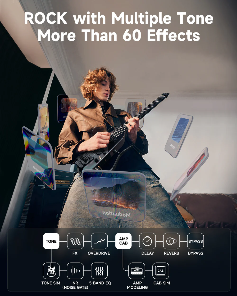 Pełna menzura 25,5” (648 mm) to standardowa skala znana z klasycznych gitar elektrycznych – naturalne napięcie strun .009–.046 i znajome odczucia pod palcami, bez potrzeby przestawiania techniki.