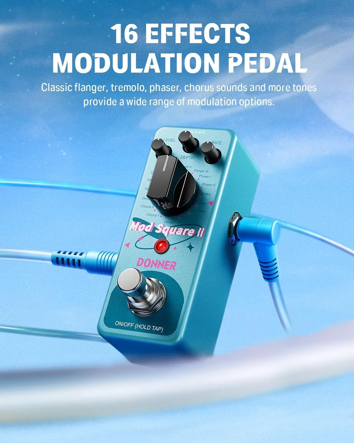 Donner Mod Square II EC6644 to wszechstronny efekt gitarowy modulacyjny, który oferuje aż 16 różnych efektów modulacji w jednym kompaktowym pedale. Dzięki szerokiej palecie brzmień możesz łatwo wzbogacić swój pedalboard o chorus, flanger, phaser, tremolo, vibrato czy rotary. To idealny pedał gitarowy do gitary elektrycznej dla gitarzystów, którzy chcą eksperymentować z brzmieniem i tworzyć przestrzenne efekty na scenie oraz w studio.