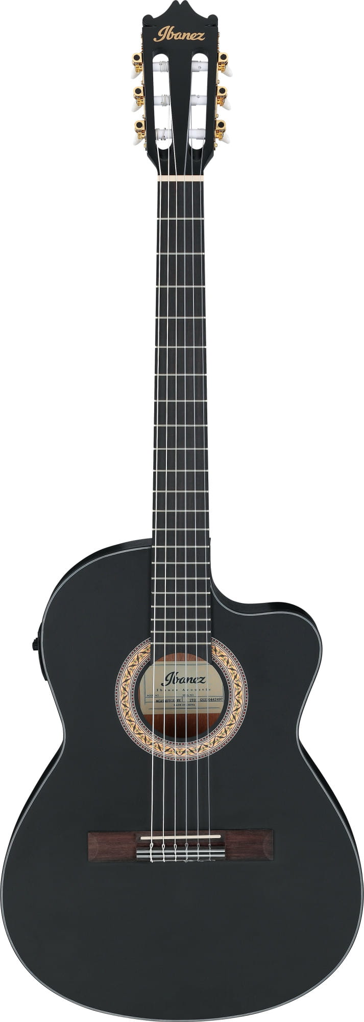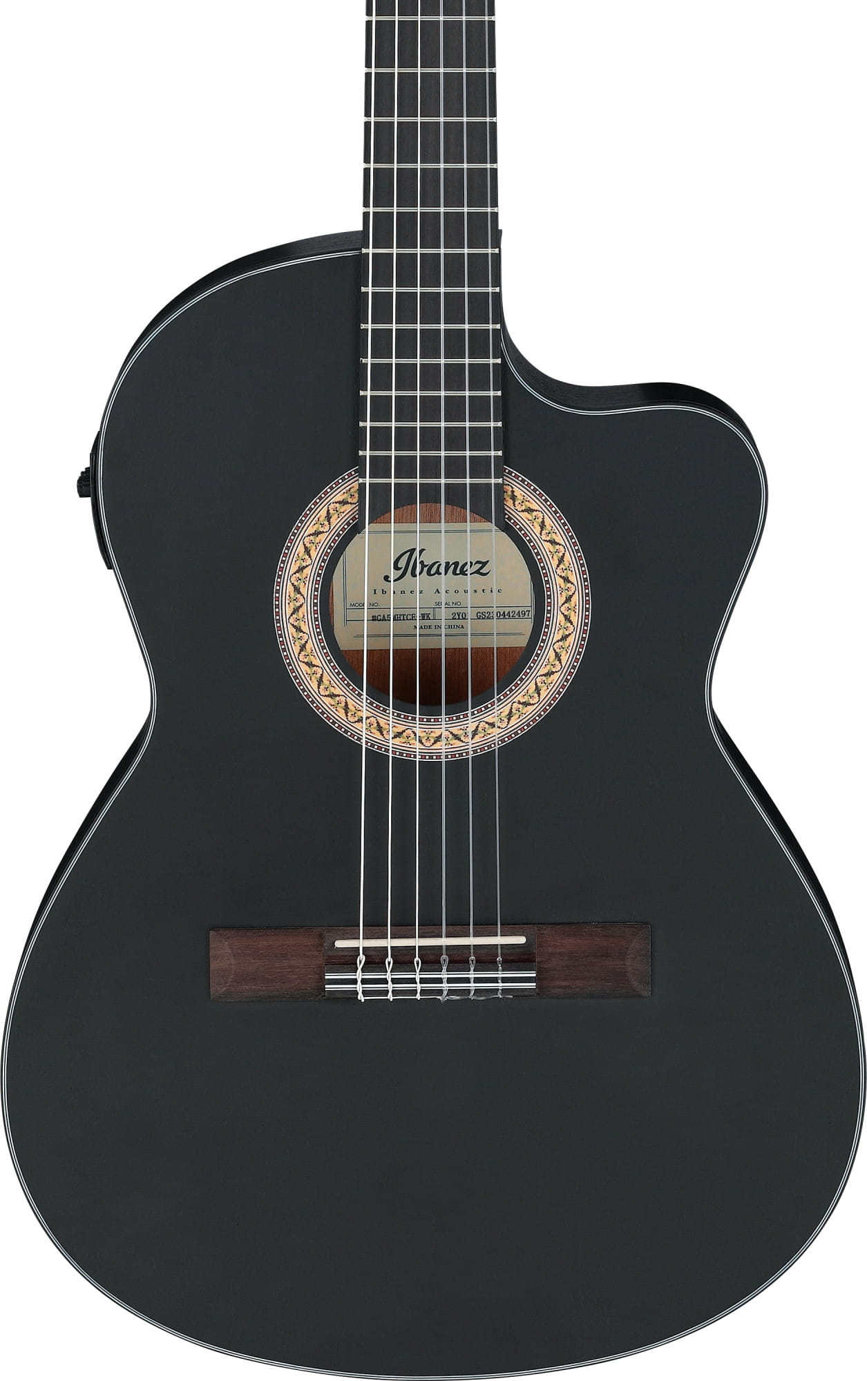 Model GA5MHTCE-WK wyróżnia się klasycznym kształtem z wycięciem cutaway, które umożliwia łatwy dostęp do wyższych progów. Rozeta otworu rezonansowego zdobiona jest skomplikowanym wielowzorowym designem, co nadaje instrumentowi wyjątkowy charakter. Czarne obramowanie z białymi akcentami dodatkowo podkreśla elegancję gitary, a mostek w stylu classical tie block jest nie tylko funkcjonalny, ale również estetyczny.