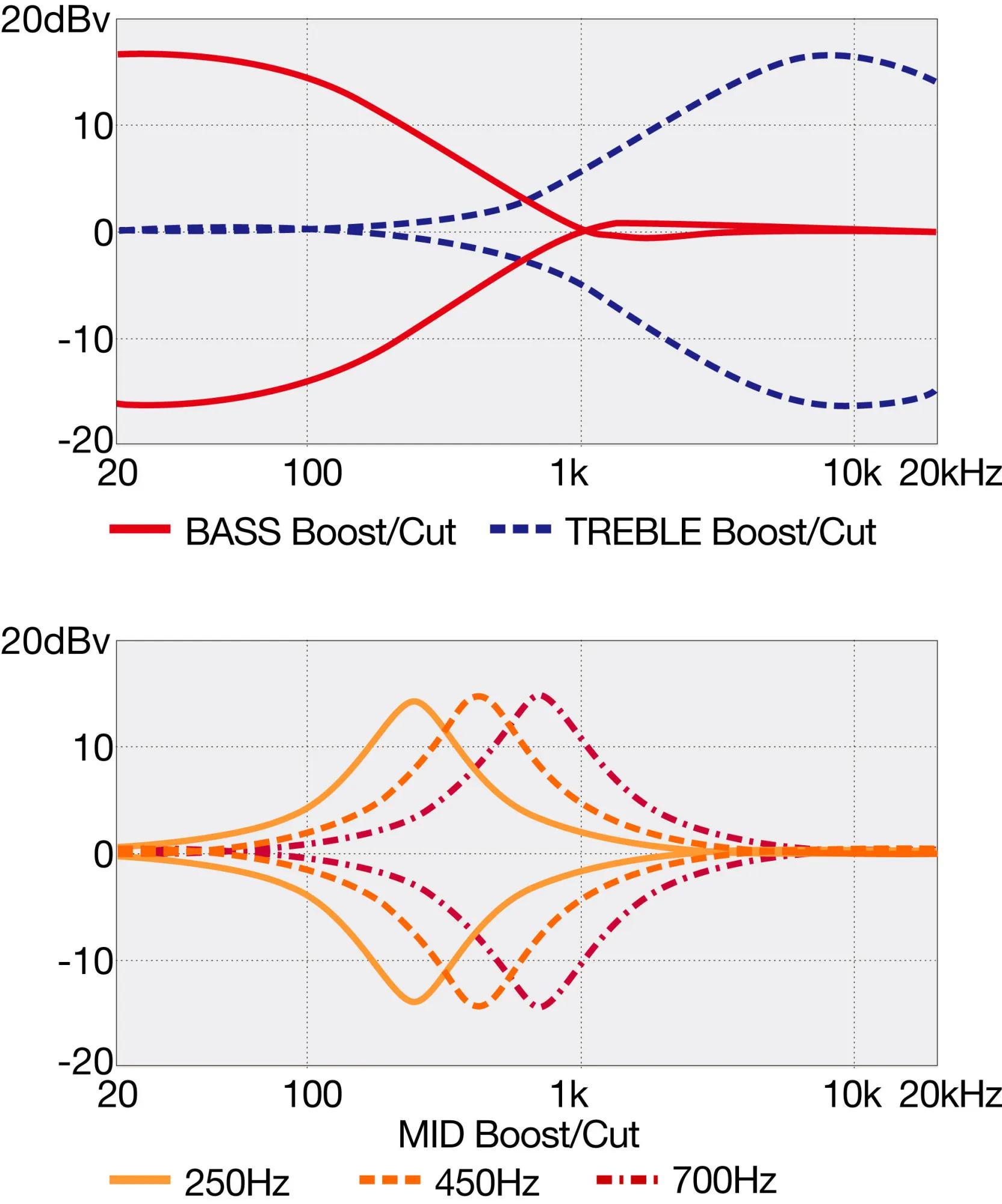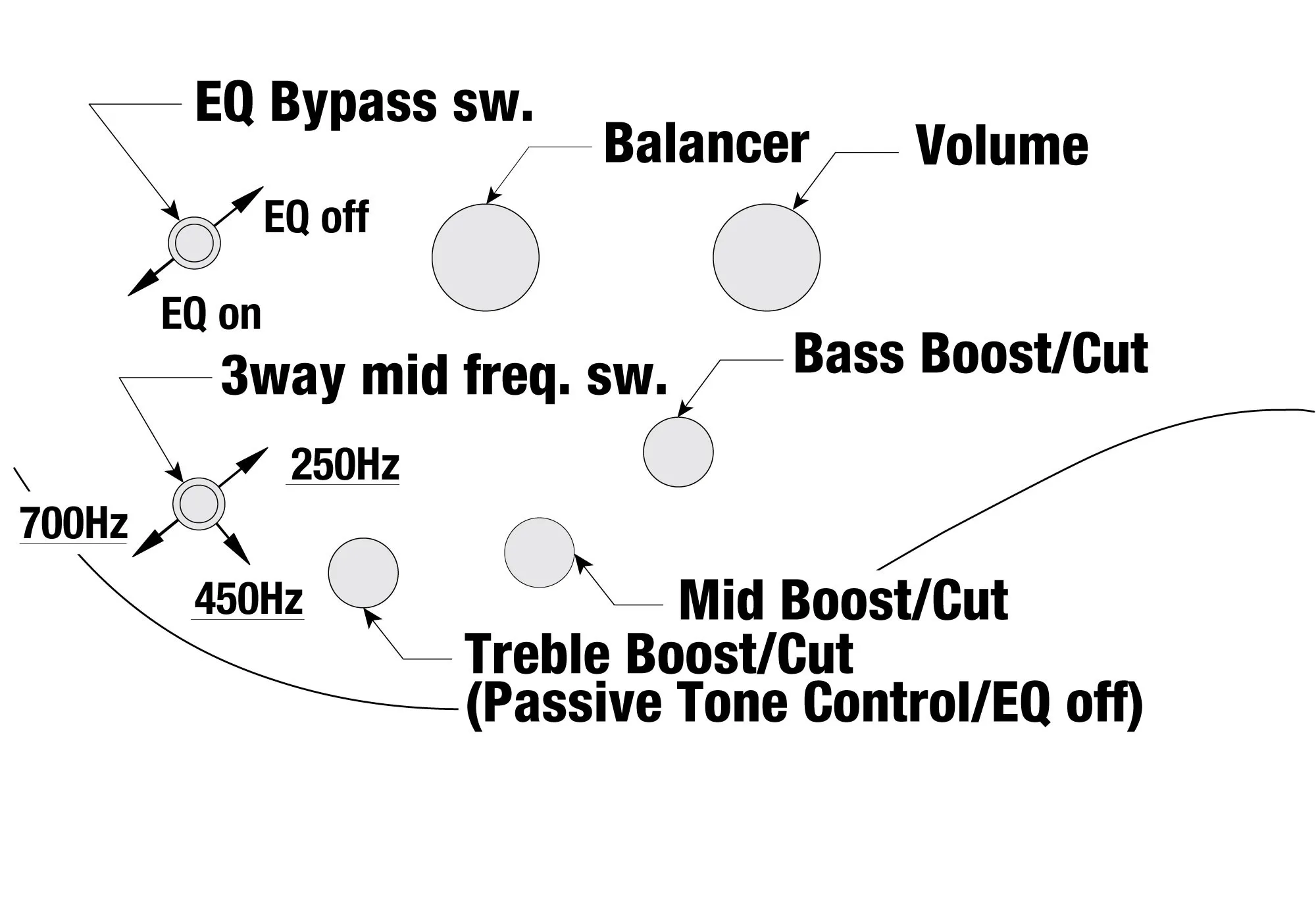 - Inne przełączniki Przełącznik obejścia korektora (pasywna regulacja tonów na potencjometrze wysokich tonów), 3-pozycyjny przełącznik częstotliwości środkowych