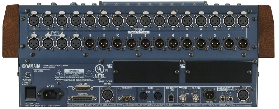 Tylny panel DM1000 zapewnia 16 wejść mikrofon/linia z symetrycznymi złączami Jack XLR/TRS, które posiadają największej wydajności przedwzmacniacze, zapewniające niezwykłą jakość audio. Wejścia posiadają również indywidualne przełączniki zasilania phantom. Oprócz tych złączy, cztery wejścia XLR ‘omni’ mogą być swobodnie przypisywane wejściom Insert lub innym funkcjom. Wszystkie analogowe złącza obsługują 24-bitowe/96-kHz przetworniki. Wyjścia analogowe mogą być przyporządkowane do każdego z 12 wyjść XLR ‘omni’. Wszystkie szyny, wejścia Insert oraz złącza do monitoringu mogą być łatwo konfigurowane, aby stworzyć idealny system, odpowiadający Twoim wymaganiom. Stereofoniczne złącza cyfrowe AES/EBU oraz koncentryczne złącza cyfrowe zapewniają niezwykłe możliwości cyfrowych połączeń. Elastyczność i kompatybilność I/O, czyni model DM1000 idealnym wyborem do produkcji muzycznej oraz wielu innych zastosowań.