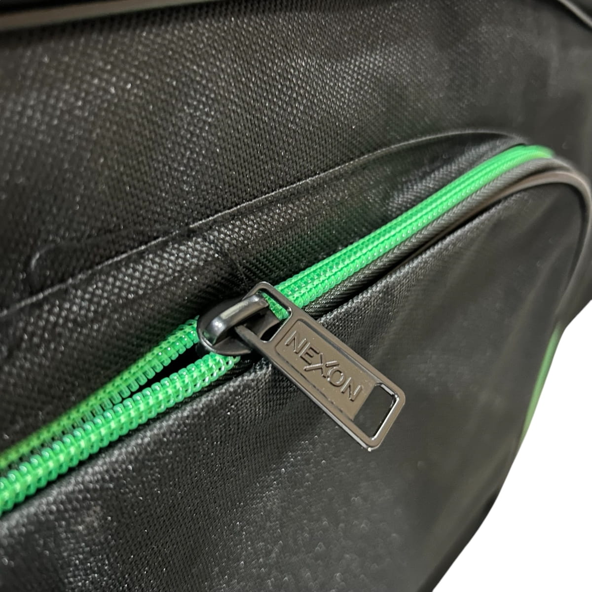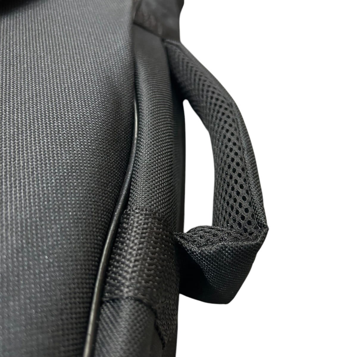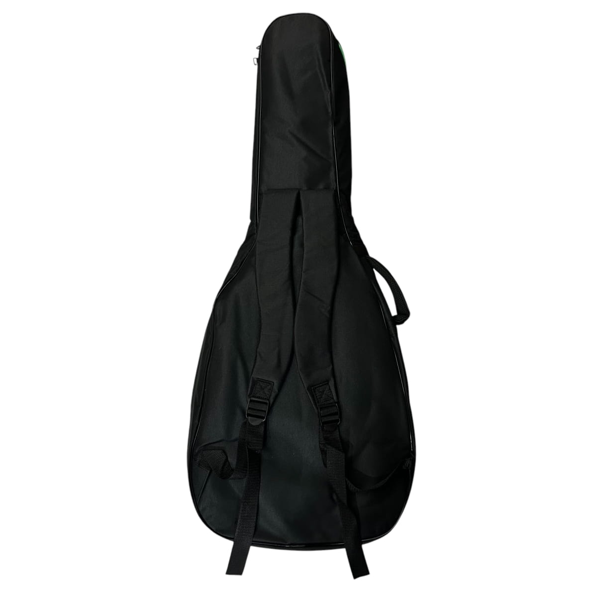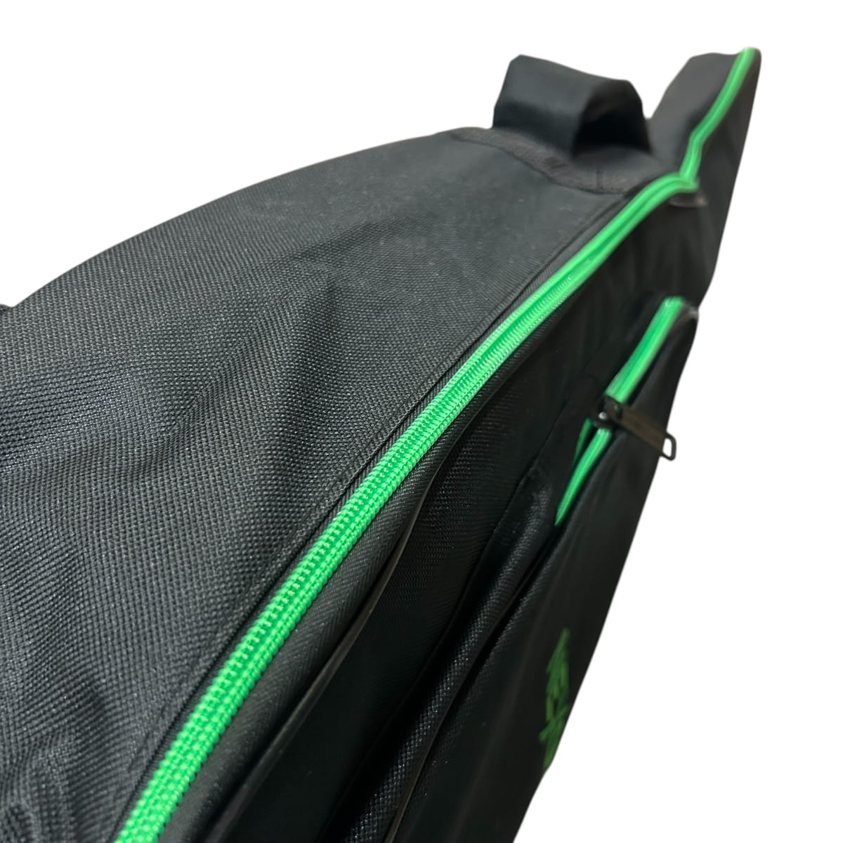 Futerał miękki do gitary basowej w eleganckim czarnym kolorze z dodatkami w kolorze neonowej zieleni.