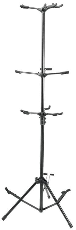 Uniwersalny statyw typu Hang-It! na sześć gitar, w którym instrument trzymany jest za główkę i swobodnie opiera się korpusem o dolną część statywu.